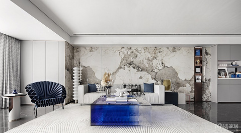 〈案例赏析〉克莱因蓝玻璃茶几线条凌厉、极具艺术感,无疑成为客厅的点睛之笔。大理石的天然纹理如水墨画般,气势恢宏地在墙面上肆意泼洒,成为客厅独特的风景。