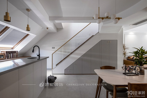 一些老房是人字斜屋顶,所以室内顶面侧边是倾斜状,居住感不舒适,且空间很局限,那么这个位置我们可以做些什么样的设计呢? 可以如图做一个休闲水吧台,也可以定制一个小书房,天窗的采光让空间更惬意。