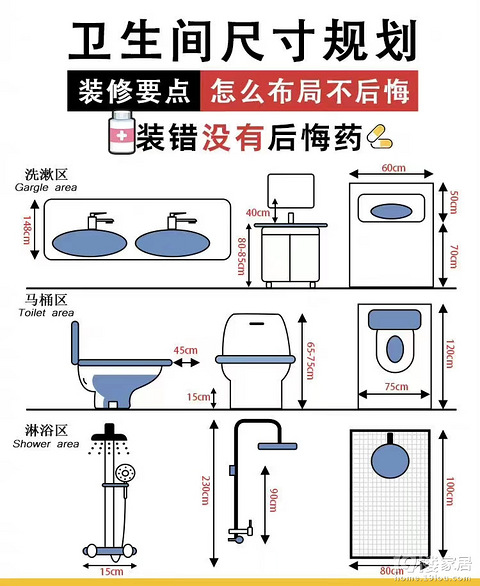 卫生间各个尺寸及舒适的布局参考,一些tips