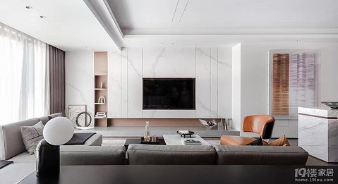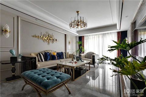 项目地址 / Address:西湖国际城风格 | Style:轻奢项目面积 | Area:230㎡客厅 客厅的空间设计让人一眼感受到奢华与气质,气派十足的灯饰、精致的造型背景,别致的茶几桌; 它们采用金色,相互衬托,为空间尽自己的一份力量;轻奢感在这些细节中,不经意间流露出来。 蓝色的窗帘不仅拥有良好的遮光效果,在视觉效果上也与橙色的窗帘搭配一绝。即使在白天看电影,坐在宽大的沙发上拉上窗帘,影院