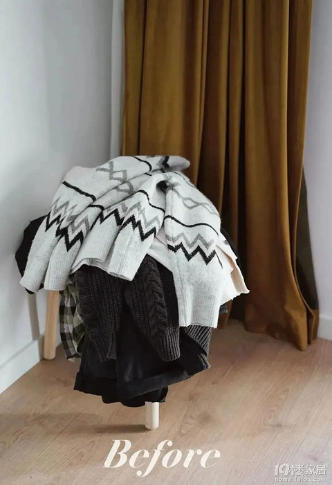 “隔夜衣”是指那些穿过但还不至于需要洗涤,下次还想接着穿的衣物。也被称为「次净衣」。 试问谁家能没有「次净衣」?秋冬的厚外套、只在家穿的家居服、不宜频繁清洗的毛衣……结果就是椅子、沙发、飘窗……都被攻占成为“次净衣临时办事处”。 「次净衣」有哪些特点呢? 1.可能还会穿,需要保持衣物的整洁,不能随手一团全都是褶皱;2.方便挂放和取用,要和干净衣物区分开。 次净衣收纳的最佳区域 模拟一下日常进屋换衣
