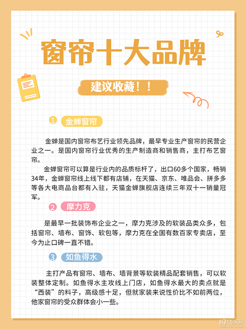 最近我发现有好多为家装窗帘发愁的朋友,大家在选择窗帘的时候难免会被众多窗帘品牌迷了眼,不知道这些品牌的优势在哪里,也不知道哪一品牌的窗帘更适合家装,今天我就把国内排在前列的窗帘品牌给大家介绍一下,把它们的优势讲给大家听。 1、金蝉窗帘金蝉是国内窗帘布艺行业领先品牌,由马伊琍代言,更好的提升了品牌力。金蝉也是最早专业生产窗帘的民营企业之一,主打布艺窗帘。金蝉窗帘可以算是行业内的品质标杆了,出口60多