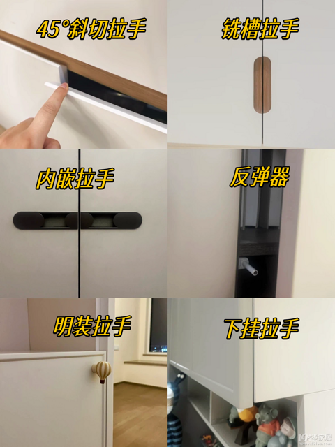 1.明装拉手优点:安装便捷,款式丰富可点缀空间,适配绝大多数柜体风格缺点:突出表面易磕碰,部分造型易积灰,破坏极简风整体整洁感建议:全屋通用款,优先选圆角、简约条形设计减少磕碰2.反弹器(无拉手配套)优点:无突出部件不磕碰,柜体纯平更极简缺点:弹簧易老化失灵,需要定期更换建议:选优质款并预留检修空间,定期检查弹簧状态3.斜切拉手优点:半隐形不磕碰,无额外配件易清洁,工艺感强缺点:板材加工工艺要求高