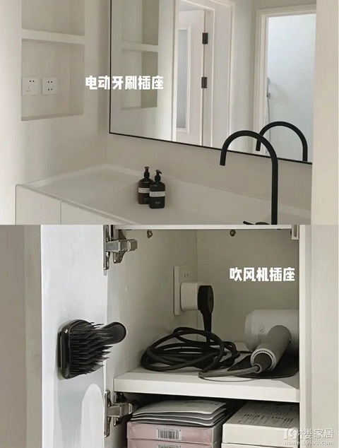 新房装修时,电源插座位置和数量同样重要,粗糙的设计师一般只考虑实用性,有些设计的位置还非常突兀不美观。注重细节的设计师会考虑到整体的风格,特别是对于喜欢极简的家庭,会将电源插座尽可能的隐藏。比如卫生间干区插座,可以从原来的墙面位置,设计在壁龛内或者浴室柜侧面,这样既实用又十分简洁。也尽可能保证了洗漱台面,不会一直乱糟糟的。#插座除了普通浴室柜,如果是做开放式隔板浴室柜,对整洁和美观的要求更高。因此