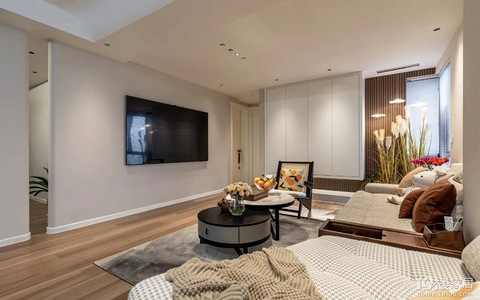 玄关处竖纹浮雕的设计立体又简约,覆盖基础鞋物收纳,顶部的金属水波纹挂件如同锦月高悬成为玄关的一大亮点,反射的倒影将整个居室都融入到画卷之中。电视背景墙采用温暖胡桃木+灰色水磨石的搭配,拼接处内镶灯带让归家观感更显连贯大气,米色沙发搭配不规则茶几,橘黄色抱枕为米白中性色主导的空间,姜黄色懒人沙发超吸睛!