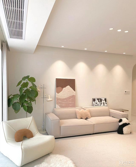 即使不做吊顶,也能实现无主灯的装修风格,即使用轨道灯或明装筒灯射灯,以及局部辅助光,使空间视觉层次丰富,同时也有灯光层次感。但需要注意的是,这种装修风格并不适合国人喜欢的明亮光线,因为灯光总会有明暗的区别,不会非常均匀。 同样不做大面积吊顶,无主灯的设计,明装筒灯和四周筒射灯都能辅助照明,落地灯也能营造氛围。但如果想要房间整体都明亮,这种做法也无法实现。 明装筒灯的做法基本都会产生阴影或亮光的差别