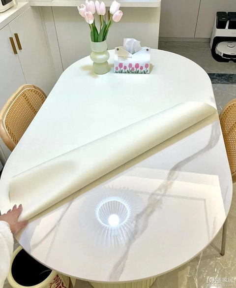 普通方桌还好,各种桌垫的尺寸都有,可到了圆边桌这里,很多人以为选择只能是桌布了。其实不然,各种圆边桌垫也能定制。 网红款罗马柱餐桌,上面的岩板台面好看是好看,但天冷了以后,显得格外冰凉,娃手都不愿意多挨一下,而且菜吃一半,就感觉凉了。 关键的关键是,换了纯色桌垫之后,竟然比原来的岩板面,颜值更高。而且,隔绝了岩板石材的那种冰凉感,明显感觉热菜凉的速度都缓慢了,并且,放碗盘,也没有了相撞叮里咣啷的声
