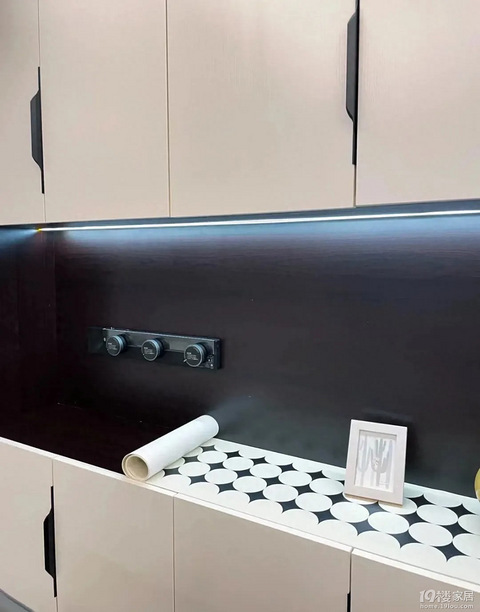 在之前的文章中提到过很多遍,开放格处,更建议做石材面。 原因是,这里可能涉水加使用频率较高,板材面用久了,弊端会比较多。可有人可能没有事先考虑到这些细节,已经给开放格做了板材面,这时,我的建议是,给上面铺一层垫子。 板材不比石材,本身就是相对不耐造的材质,如果在损伤后再铺,那就是悔恨后的补救措施了。而提前铺的目的,防滑防污是其次,最重要的是防水。因为这个区域,按照规划会出现烧水壶、管线机,其他饮水