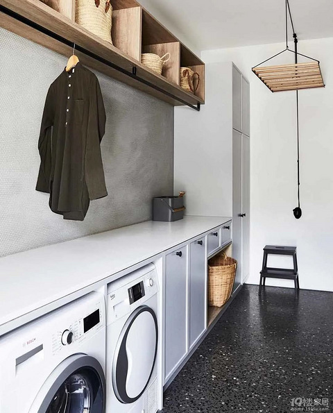 建议能安排两处晾衣架,分别配置在吊顶和吊柜下方。吊顶的晾衣架通常能一次晾晒全家人的衣物,而吊柜下方的晾衣区,则是能安排吊挂袜子、内衣裤、小孩衣物这些小配件。 没有太多空间能做晾衣架,也能在墙面安排隐藏式的晾衣架节省空间。挂在墙上,平时不用时能盖起来,视觉不凌乱。需要用时再打开,能简单晾晒毛巾、衣物。 也能选择折叠式衣架,贴在阳台门上不占位,小空间照样能晾衣。