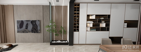 本案选取了客餐厅作为极简风案例的分享对象,整体中性色调,熟练运用色彩,将浅色系与暖色调的棕咖色系相结合,简约干净,奢而不华,纯粹颜色的碰撞打造出精致高级的时尚住宅同时兼具简约与奢华的特色,展现了不同的艺术风格。客厅电视背景墙以竖纹硬包做正面设计,配合旁边的木饰面板设计,延伸餐厅。中间以绿植点缀,为中色调的墙面增添了一丝禅意。客餐厅连接一体,造型简洁,延伸视觉,与一旁的白色储物柜有拼接色的效果,并且