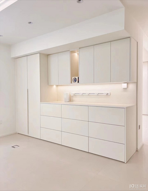 对于无法设立储物间的家庭来说,无底板柜的出现无疑是一个福音。无底板柜直接在墙面做隔板,没有底板和层层隔板的限制,使得空间得以充分利用。这种设计不仅可以轻松容纳各种清洁工具、闲置家电和一些带轮的物品,如玩具箱、带轮收纳箱、小推车等,而且还可以为扫地机器人提供充足的活动空间。 扫地机器人在日常清扫中发挥着重要的作用。无底板柜的设计使得扫地机器人在工作时可以完全不受柜体的影响,自由进出,轻松隐身。这种设
