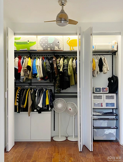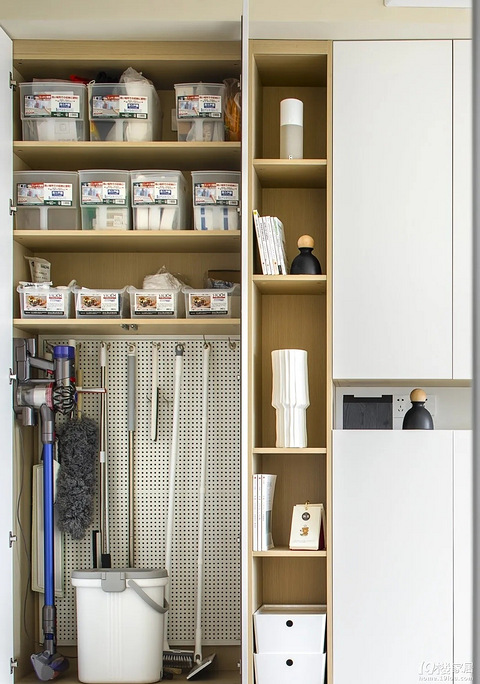 邻居家的面积和我家的一样大,所以家居模块几乎也差不多,但在收纳上她却赢了我,因为她真的是把收纳利用到极致。她家在客厅收纳柜上,着重加了一个家政清洁柜的摆放,里面还定制了洞洞板来悬挂清洁工具,比如说吸尘器、扫把、拖把桶、刮玻璃工具等清洁工具;上面还有各种收纳盒,在装修的时候提前把尺寸弄清楚,这样才可以放置各种工具箱,还有药箱等等。她说这样做收纳系统,让家务动线更加清晰明确,再也不需要找一个螺丝刀就翻