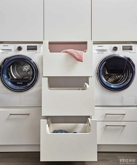 在阳台稀缺的公寓中,建议一定要搭配烘衣机,不论晴雨都能快速烘干衣物,省下晾衣麻烦。 当空间太小的情况下,洗衣机和烘衣机最好叠起来,并用嵌入式的设计融入柜体,省下不少空间。