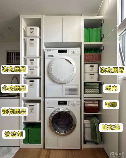 洗衣房需要收纳的杂物很多,洗衣夹、衣架、洗衣液、清洁剂、洗衣袋、脏衣篮等。韩国主妇通过良好的收纳规划,让这些物品收得一点也不乱。