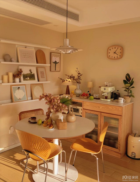 大体上,餐边柜的设计分为两种:一种是占据整面墙的“霸道总裁”式柜体,另一种是较常见的地柜式小清新。 我们先来看“霸道总裁”吧,这种设计大气的要命,上部是吊柜,下面是地柜,不过安装的时候可得小心,要是吊码不够牢固,整个餐边柜就可能变成“自由落体”,安全问题可马虎不得。另一种设计是上下柜连体构造,它的承重能力主要靠自己,安装技术的要求相对较高。 在设计满墙柜时,我们要注意顶柜不要安装上封板,这样才能让