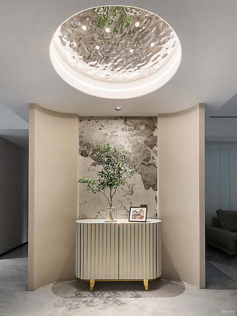 玄关处竖纹浮雕的设计立体又简约,覆盖基础鞋物收纳,顶部的金属水波纹挂件如同锦月高悬成为玄关的一大亮点,反射的倒影将整个居室都融入到画卷之中。 电视背景墙采用温暖胡桃木+灰色水磨石的搭配,拼接处内镶灯带让归家观感更显连贯大气,米色沙发搭配不规则茶几,橘黄色抱枕为米白中性色主导的空间,姜黄色懒人沙发超吸睛!