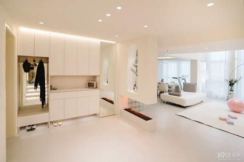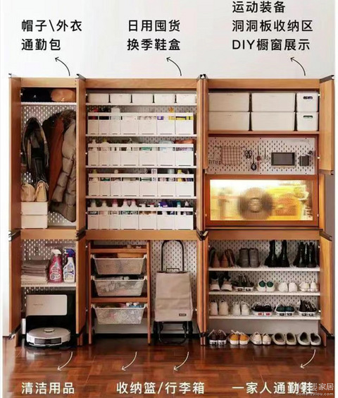 此外,无底板柜的设计也适用于鞋子储物一体柜。鞋柜区无底板部分可以用来收纳常穿鞋和拖鞋,储物区则可满足买菜篮、收纳篮、甚至小推车的放置,而家政区底部则可以用来收纳扫地机器人等。如果空间充足,无底板柜内还可以收纳一些大件重物,如折叠梯、空气净化器、挂烫机等等。总的来说,无底板柜的设计打破了传统的储物模式,为我们提供了一个更加灵活、实用的储物选择。它的出现不仅解决了空间不足的问题,还为我们带来了全新的储
