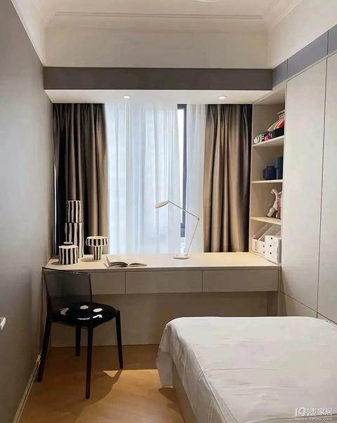 窗户采光比较足,把飘窗往外延伸,打造一个临窗书桌,房间也可以有学习和工作的地方,充足的光线和窗外绿茵一定会带给你好心情,但要注意留下可以放脚的地方。而要做书桌型飘窗,需要注意以下问题:①书桌高度在70-80cm之间较合适,具体高度参考使用者身高;②书桌和窗户之间要预留窗帘的缝隙,一般在15cm左右,如安装了电动窗帘,应在20-25cm之间。同理,将这里改造成梳妆台也是可以的,这点要看女主人的需求。
