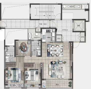 小区 | 公望公寓项目类型│公寓项目性质│精装全包项目面积│99㎡项目风格│现代装修公司 | 诚层装饰原始图方案布局图客厅:应客户要求,想要体现沉稳又现代年轻化的感觉,所以客厅采用1.2×2.4m奥斯卡灰大板瓷砖,沙发背景采用胡桃木色的木饰面,再加上无主灯的设计,从而提升整体的视觉感。厨房:厨房材质是选用带肤感台湾膜,除了能防污渍,手的触感也是绝佳的,优点在于易擦洗,给人清爽的视觉感。柜门使用的是