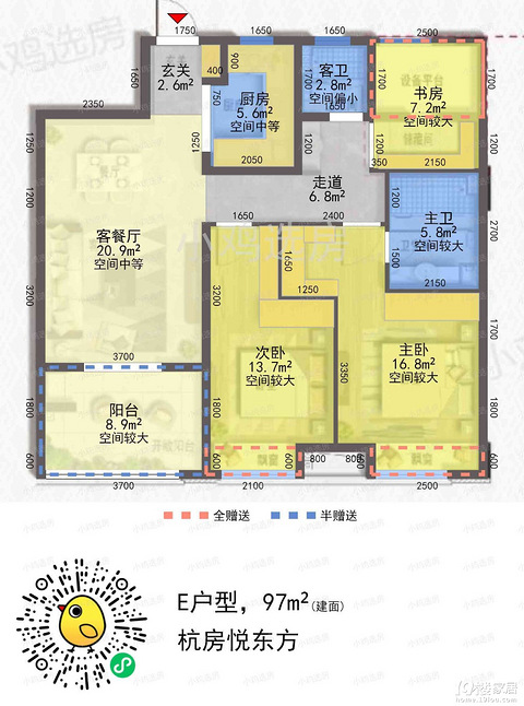 楼盘小区: 悦东方面积:97.2装修公司: 老叶帮装修+邹项目经理+Designer Yu硬装费用: 预计半包10万(含地暖回填,全屋木纹砖),硬装一共17万软装费用: 8万风格:这次计划尝试不同的风格,打算用原木风。房子是给老爸老妈住的,简单舒适方便为主。户型图(与图片对称): 这个户型特别喜欢,三开间朝南,得房率超高,有94%,虽然是中间套但是通风特别好。已经是第三次装修了,之前都在19楼开过