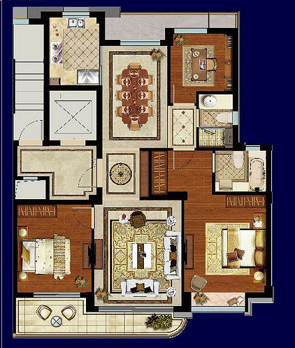 先来个整体户型尺寸图,还有效果图吧,客厅是全景的,不知道咋放,就截图几张了。 整体尺寸: 几张效果图: