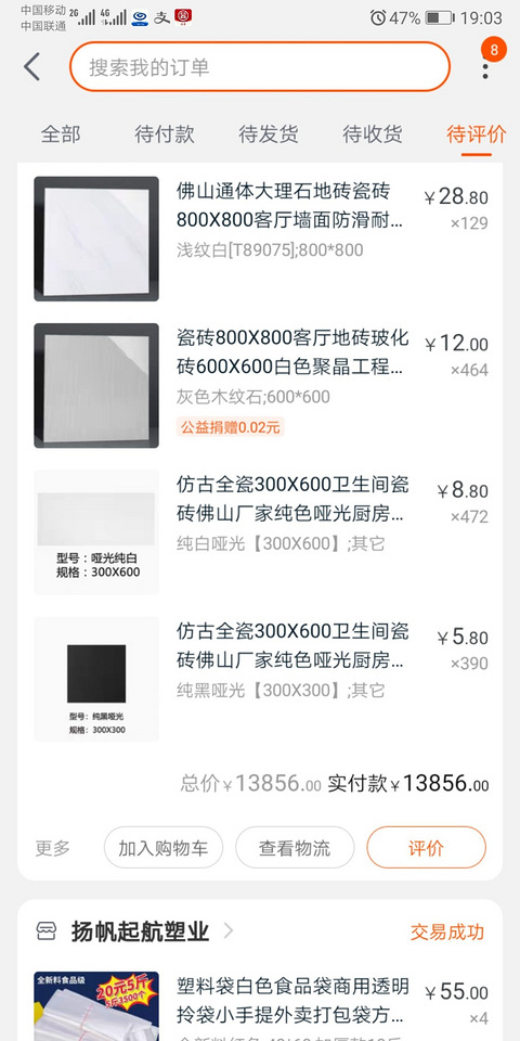 前两天说到我说到买瓷砖,今天终于全部上楼了,瓷砖花了我一万三,上楼比我预想的便宜,加黄沙一百包上楼三千块,所以我瓷砖从买到我家楼上花了一万九,以后等我装修好了有楼友想要花费清单可以私聊找我。我瓷砖网上买了很多次了,反正感觉性价比还是可以的,当然追求品牌的朋友当我没说。这两天水电工泥工都没来,可能去别的地方干活了,我也没办法,毕竟不可能只干我一家的。这是我买的瓷砖,60的是抛光砖稍微差一点,因为没有
