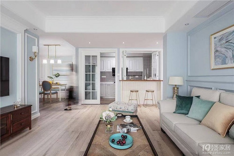 虽然是美式风格不过这里走的是清新路线,全屋以蓝色背景墙为主,搭配白色柜子、浅色家具,整个营造出的是一种自然清爽、舒适自在的环境与氛围。
