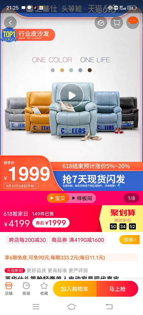 老房子改造一直对沙发选择困难,在一次聊天中朋友极力推荐头等舱沙发,说超级舒服。但是一.本人不喜欢皮质沙发觉得有味道,二.了解下价格比较贵,怂了哈哈。但是朋友一个劲儿推荐,我打算去研究研究。 打开我心爱的淘宝软件,找到头等舱旗舰店,看直播等双11各种套路下来,价格还是能接受。虽然有些人说淘宝和店里的不一样,但是8分像我就能接受哈哈。 第一款黄色沙发是皮质的,之后电动的,还可以
