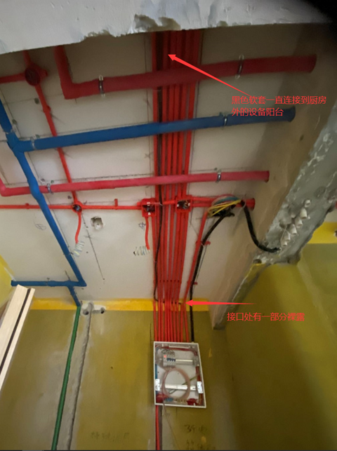 今天来看一下家里的水电情况,看到这个不是理解,问问楼里的各位大佬们。电箱出来一根管道,管道和黑色的套连接,但是接口处有一部分裸露在外。这根线经过厨房,通向外部的设备阳台。电工师傅这样做会有问题吗?
