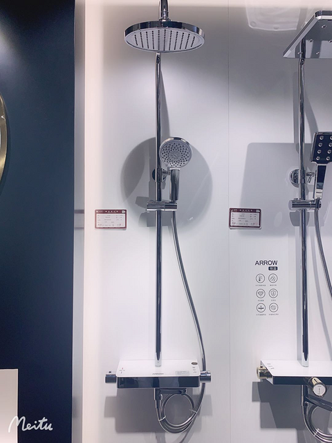 因为我家小区水压不是特别稳定,之前洗澡的时候容易忽冷忽热,这次想换一款恒温花洒上周末的时候去箭牌逛了一圈,发现了一款颜值超高的恒温花洒,型号:AMG13sh801H。有两个颜色:一个白色一个黑色,顶喷都是可以360°自由旋转的(对于我这个矮星人来说用处不大),3种出水模式(顶喷、花洒、下出水),还设计了置物平台,可以放一些随手的东西。左边是出水模式旋转切换,右边是温度调节开关,正常扭到卡死位置是4