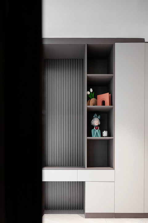 跟林工是在19楼的家装展认识的,相谈甚欢,他的设计想法都非常棒,我们当场就加了微信发了户型图给他,还约了下次看设计图的时间,整套房子装修下来给我唯一的感觉就是轻松,全程都是设计师和项目经理忙前忙后,我们只需要动动嘴皮子,最后验房的时候更是出乎我们意料地好。◆ 设计亮点:四房改三房,开放式书房空间,现代简约风格,主色调浅灰色,黑色深灰点缀,整体较为耐看,同时圆弧元素加入,提升整体视觉焦点。◆ 房屋信