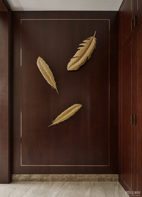 设计师说:接触本案时硬装基础已经完成,软装后期有根据软装进行小改动。屋主喜欢轻奢风,故家具选型简约而不简单,增强空间层次感。为了更凸显时尚感,会选用饰面上以亮色勾边的家具,增强空间的现代感,以表现屋主独到的品味。 玄关:深棕色木饰面镶嵌矩形金属线条,以金色羽毛做装饰,色彩的过渡完美连接了客餐厅,精致大气的造型营造出玄关的开阔感。 客厅:木作是现代家庭中常用的装饰设计手法,保留原木色彩与天然纹理,将