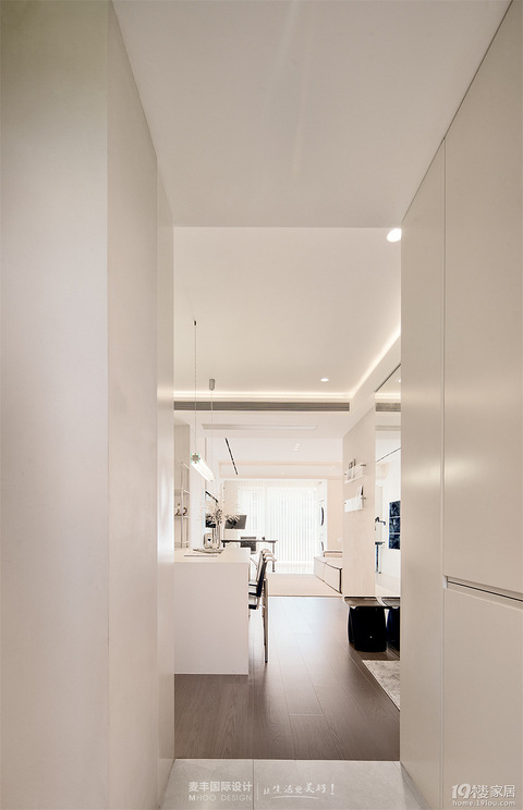 -钱江蓝湾88㎡现代风- 是拥抱朝阳脱去往日惆怅的蜜糖;是不负勇往伴月倦怠归来的灯光;是所有追寻的起点和终点;是累了疲了时,最想回去的地方。 延伸|空间的无限法则入户玄关柜和橱柜齐平,虽然占地不大,却能容纳20双鞋子,左墙配有整面落地镜,简约主义的基调缓缓拉开序幕。 一张蝴蝶凳静静地坐落在这,美的让人挪不开眼,曲面的木板与黄铜杆冷静简练的气质,阐释着极简空间的态度。 主厅一眼扫去,空明,透彻,尽情