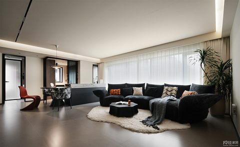 今天带给大家一套刚落地的意式风,。140㎡的面积,恰好为意式提供了足够的演绎空间,既有大平层的开阔感,又藏着意式独有的舒适与高级。 客餐厅设计: 这是一处四通八达的家庭功能区,以黑白灰为基础,加入少量橡木色点缀,不会沉闷无聊。顶面摒弃复杂的吊顶,无主灯搭配隐藏式照明,营造柔和均匀的光线氛围。白色乳胶漆墙面干净纯粹,黑色金属线条利落冷静,瞬间提升空间的艺术气息。 花瓣沙发占据客厅c位,弧形花瓣轮廓