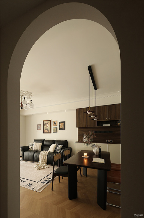 对于89㎡的刚需户型来说,不必追赶潮流,用喜好一点点填满新家,偏爱旧时光的温柔质感。 推门而入,浅杏色和胡桃木包裹视线。双眼皮吊顶,天花板只以石膏线勾勒简约轮廓,搭配圆润弧度的拱门,复古感瞬间拉满。 客餐厅是小夫妻喜欢待的地方,阳光透过单层金刚纱帘,在浅胡桃木地板上洒下斑驳光影。客厅C位摆放一张软糯造型的真皮沙发,毛毯懒懒地搭在地上,让人想窝进里面。 背景墙挂上木框装饰画,给大白墙稍作装点。地毯上