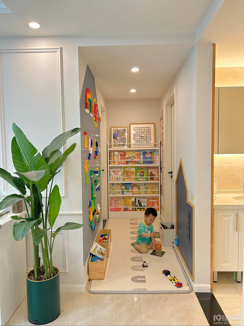精装房装修中规中矩,若遇上活泼好动、学习任务艰巨的“神兽”,就显得力不从心了。安全隐患、学习氛围、书籍收纳统统都有待解决。 学龄期儿童好奇心重,很容易被各种外物影响专注力,因此给孩子规划一个专门的学习区很有必要。改造关键点:1.空间选择:首选儿童房空间,孩子喜欢有自己独立的房间,安静、私密、有安全感。若家长希望能随时关注到孩子的学习状态,也可以在客厅或书房一角规划出孩子的学习区。学习区的采光应以自