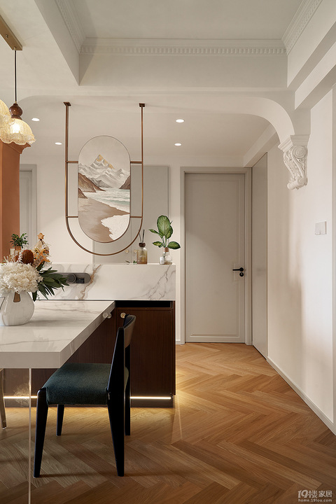 项目地址 / Address:逸品春江设计施工 / Co :铭品装饰风格 / Style:美式项目面积 / Area:93㎡业主是一位花店的店主,平常就喜欢美的事物,对于装修也有许多自己的想法。对于施工的落地效果,业主的品味也占着很大的比例。不得不说 美式复古装修,仿佛走进了老电影里的美式浪漫。配上复古家具。温馨而不失格调,每一帧都值得截图留念。这个空间设计上,客餐厅一体,动线流畅。居家生活方式惬