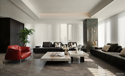 客厅一进来就被震撼到,大面积大理石地面 + 硬朗的深色护墙板,质感直接拉满。电视墙做了大理石拼接,中间嵌入大屏,旁边的开放格又能摆点摆件,简约又有格调。 黑色皮质沙发沉稳大气,那一抹红色单人椅就是点睛之笔,瞬间打破沉闷,显得特别有品味。空间采光绝了,大落地窗让阳光洒进来,整个客厅通透又大气,不管是自己放松还是谈事,都特别有排面。 餐厅和客厅连通,大理石餐桌 + 简约餐椅,耐看又高级。一家人吃饭、朋
