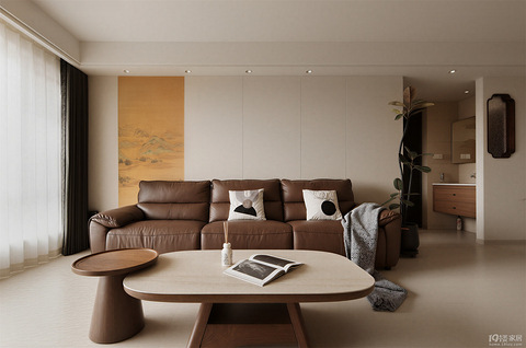 以现代侘寂风为基底,用浅米灰墙面与深棕皮质沙发打造松弛的视觉重心,山水艺术墙与木质格栅电视背景墙形成材质层次。整面白纱帘最大化引入自然光,让空间通透又柔和;悬浮式电视柜与隐藏式收纳柜,把杂物彻底 “藏” 起,只留艺术感与松弛感在空间里。动线设计上,客餐厨一体布局打破空间壁垒,无论是家庭互动还是亲友小聚,都能在开阔的场域里自然发生。 长桌采用木石拼接台面,温润木质中和石材冷感,既是用餐主场也是轻办公