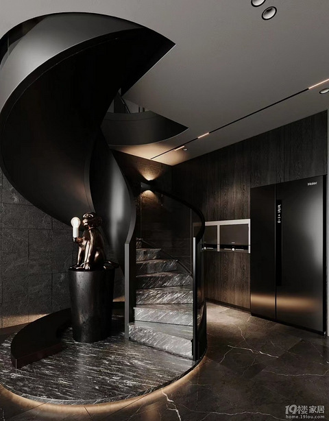 家是业主自己语言和温度的另类表达,感性与理性两者的平衡,皆镌刻进所处空间的色彩和线条里。叙旧谈心、品尝美食、自律生活……那些灵动的碎片,拼凑出一个“大我”世界。在设计师看来,好的设计就是创造和满足人们物质和精神生活的需要,将设计融于人性,将家居带入悠闲自在的情境。 下方悬空的玻璃楼梯做到了“避而不挡”,既回避了玄关处的视线但又不完全遮挡空间,提升了居室的层次感;黑玻的质感配以镂空的楼梯踏步,在光影