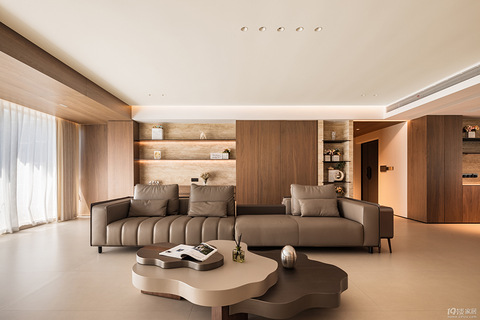 本案业主为年轻夫妻、常年因工作出差不在本地,但装修上相当注重,偏好简约风格与木纹/肌理感材质的审美倾向,设计师在“实用便捷”与“美学体验”间找到平衡点,既满足长期出差后的舒适回归需求,又通过质感材质传递家的温度,同时兼顾空间的低维护性与功能性。 房子基本信息:小区:绿城琨玉面积:199 户型:4室2厅风格:现代意式施工:都都装饰 客厅 整体