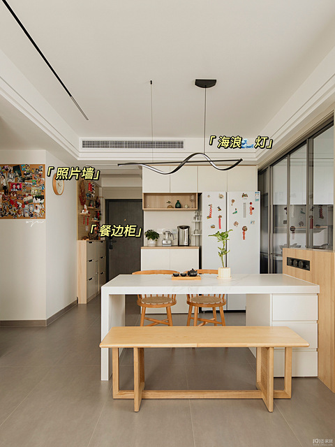 项目面积:73㎡项目地址:新安天苑设计风格:原木宜家风 设计理念 空间以白色为主基调展开,同时搭配原木装饰,运用木色与纯白的交融结合,营造一个简约温馨的家 设计亮点 入户玄关的洞洞板,充分利用上层空间置物,高颜值的网红风一下子就来了 客厅放弃传统的电视墙,利用投影仪+升降幕布的形式形成新的观影体验,幕布放下是观影墙,幕布升起是储物柜,一举两得 餐厅的岛台餐桌,嵌入一个轨道插座,完美解决了插座不足
