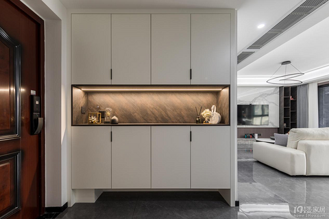 硬朗的直线线条与软装的菱形、圆形等线条完美结合,使整体风格简约而不失温暖。 地址:铁建国际城户型:三室两厅一厨两卫面积:130m?风格:现代简约装修公司:中博装饰玄关设计师在玄关处的设计下足了功夫,既满足了我们日常使用需求,又给到入户第一眼的惊艳效果。 客厅 硬朗的天然大理石与柔软的皮革和木材完美结合,使得整体设计既具有现代的精英气质,又不失生活的“烟火气”。整个客厅的色调以灰色和白色为主,为了满