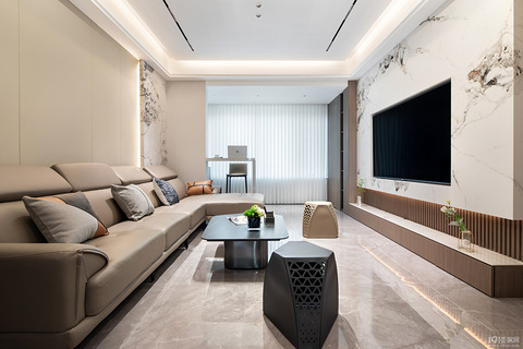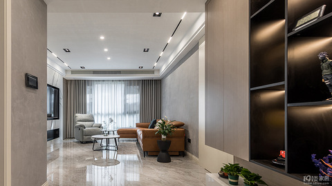 本案是一套129㎡的房子,业主是一个三口之家,男业主从事的是金融行业相关的自由职业,有很多的时间需要在家办公,希望可以有一个书房空间。女业主是一名服装从业者,比较偏爱简洁、干净又实用的设计,所以对于新家的装修风格方案,也希望尽量简约高级一些,比如有雅致耐看的配色、有棱角分明的线条感,有通透宽敞的空间感等等。 永兴首府129陈军现代简约都都装饰 客厅 阳台打通纳入客厅,扩大室内空间,有效提升采光通透