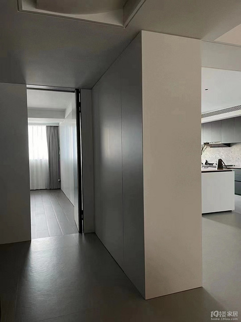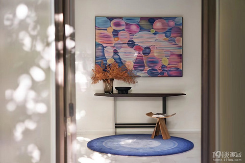 自己比较注重家庭集体活动与交流,更愿意一家人围坐一起聊些家长里短、增进感情,所以选择了横厅户型。 由于原户型布局较好,所以设计师基本未作改动,仅仅通过大胆时尚的色彩搭配与简洁明快的线条勾勒出这个堪比大平层、三世同堂的现代住宅空间。 设计施工|良工装饰项目面积| 130㎡项目风格| 现代轻奢户型| 四室两厅 01玄关 入户即见过道,尽头有装饰画点缀,既是一道靓丽的风景线,又丰富了公共区域的层次感和装
