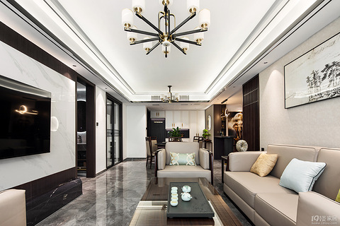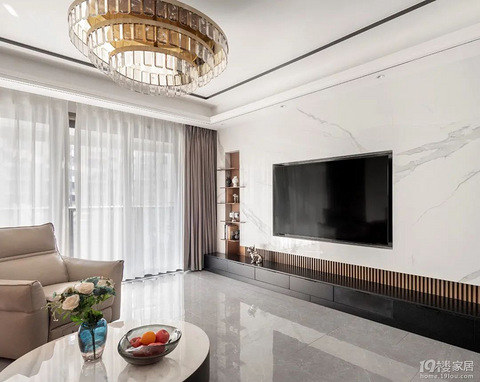 户型解析项目地址 / Address:龙湖滟澜山设计施工 / Co :铭品装饰风格 | Style:现代轻奢项目面积 | Area:147㎡设计亮点: ① 整个客厅运用圆弧和矩形的形态穿插勾勒出每个空间的立体感,圆弧的吊顶处理让空间没那么生硬,显现出更多的柔和感。 ② 将大理石、硬包板、金属、等元素有机地组合在一起,电视背景墙,看似简单,却有着个性十足的高级感。 ③ 餐厅、厨房呈开放式布局,罗马柱