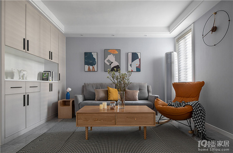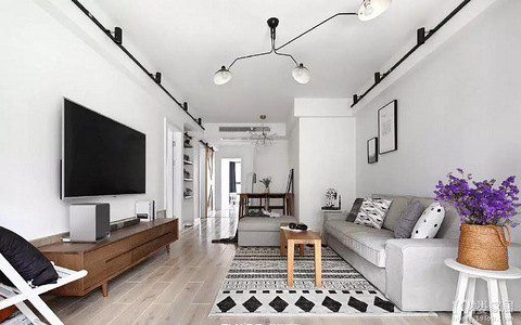这套80平的北欧两居室,全屋以白色、灰色为主色调,家具多为原木材质.业主希望室内有较大的活动空间,所以在设计师在设计时,把客厅和餐厅规划的特别简洁宽阔。房屋信息户型 两居室使用面积 80平米客厅 客厅只刷了大白墙,沙发选了灰色布艺材质,柔软度满分。电视直接挂在墙上,下方放一深木色电视柜,用于收纳物品。 沙发墙布置很简单,只在沙发左侧墙面悬挂一大一小两幅装饰画;沙发两边各放有一个白色小茶几,上面摆着