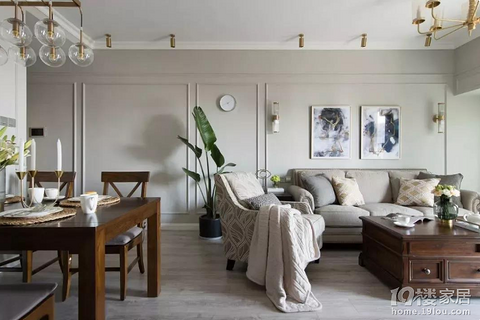 【 小区】:宋都东郡国际嘉湾 【户型】:3室2厅 【面积】:93平 【风格】:简美式 【施工】:江水平装饰 户型图 入户玄关走廊通往了厨房和客餐厅,厨房的门洞让玄关少了一些做柜子的空间。迷你鞋柜的底部和中间留空,这样使用起来更方便。 餐厅和客厅之间是没有做隔断的,墙面都是简单的做上石膏线边框,沙发背景墙上方有着挂画和壁灯作为点缀。 餐厅背景墙的设计和沙发背景墙基本上相同,颜色也刷成了一样的,看