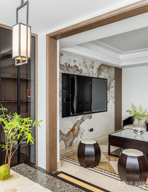 本套是160m?富春望三居室户型,业主喜好喝茶,便把阳台包进客厅,打造成开放式茶室,品茶、赏景别有一番滋味。 风格在装修风格上,设计师将中式元素与现代材质巧妙兼容,几笔简练的线条,勾勒出无限意境,寥寥数笔,却春风十里,这就是新中式的韵味。 业主需求业主喜好中式元素,又有饮茶习惯,希望整体空间富有中式韵味,同时又能留一寸净土,品一壶好茶、听一首好曲、赏一处美景。 客厅区域是开放式的,步入空间,静观沉