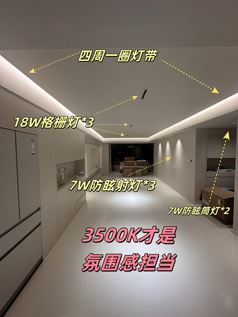 硬装终于毕业!最不后悔的决定之一就是坚持客厅3500K无主灯+厨卫4000K的选择!当初纠结色温时差点被劝退——“3500K会不会太黄?”“会不会不够亮?”但实际落地后:真香3500K的氛围感直接拉满!! 【无主灯避坑Tips】1? 灯位布局:提前规划沙发、茶几、电视墙的重点照明,避免“满天星”翻车!2? 选防眩射灯:见光不见灯才是精髓,深杯防眩不刺眼,抬头不闪瞎!3? 色温统一:同一空间所有灯具